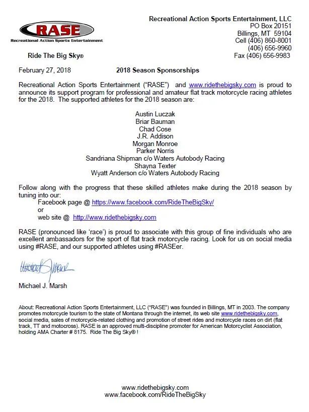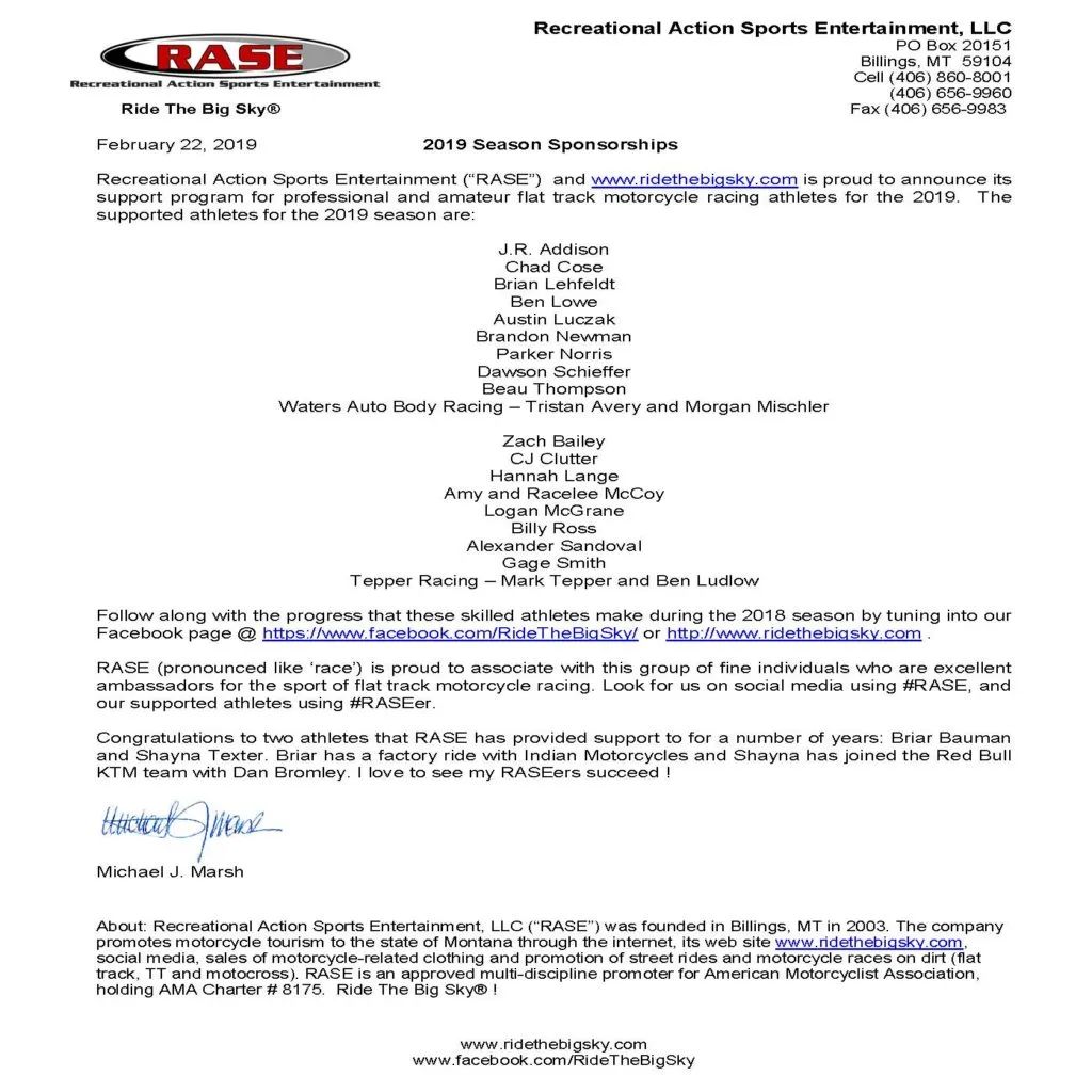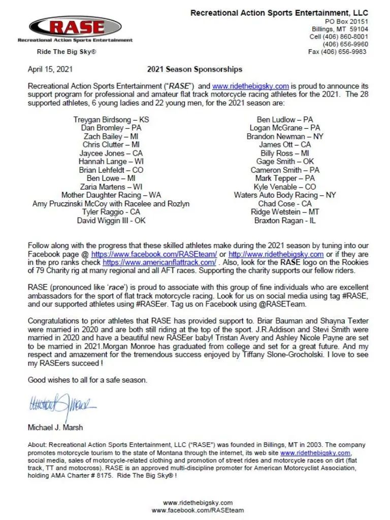 Recreational Action Sports Entertainment, LLC (“RASE”, pronounced like “race“) and Michael Marsh provide sponsorships to a number of local, regional and national athletes competing in the sport of flat track motorcycle racing.